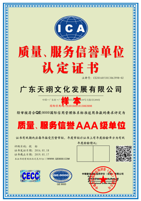 通过审核,对符合“QE:9000国际信用管理体系标准”的单位颁发证书,在中国企业信用网公告查询。提升企业品牌的知名度、信誉度、影响力和竞争力。